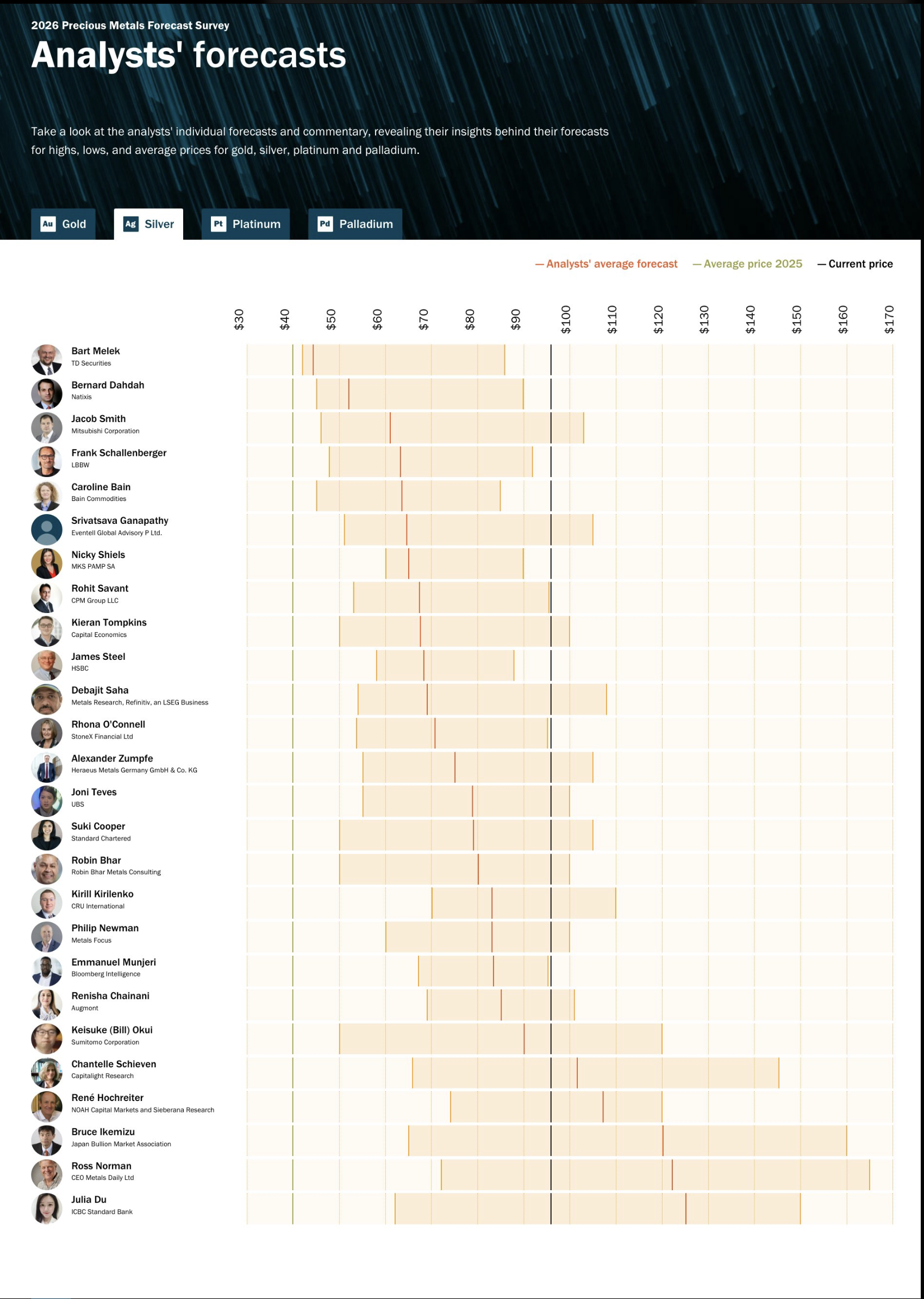 Below are several different analysts Silver forecast for the 2026 price of Silver.